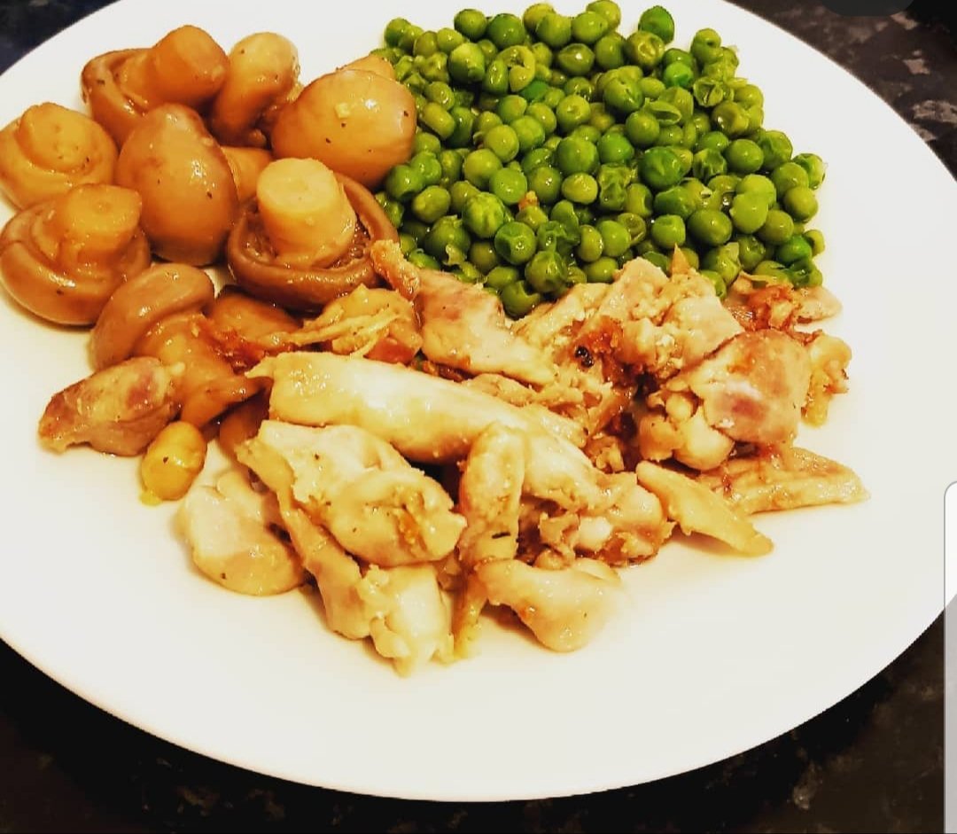 This dish is very easy to prepare and does not take much time to cook. You need a chiken breast, green peas fresh or frozen and mushrooms fresh or pickled. Cut the chicken breast and cook in a pan with a tablespoon of olive oil for about 15-20 minutes. Then put the mushrooms and green peas in a pan for 15 minutes. The bowl is ready to be served after we put salt and pepper on it. Try to enjoy and share the food with the people you love. Be grateful and appreciate everything you already have in your life and you will see real happiness. Be blessed and don’t forget every change that starts with you.🤗🤗💕